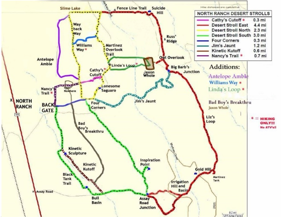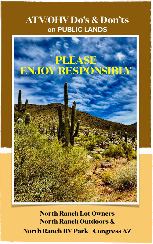 The North Ranch community and North Ranch RV Park in Congress are located adjacent to Federal Bureau of Land Management (BLM) land. Access to this land is a privilege andwe want to protect it. The BLM land leads into Arizona State Trust land which requires separate permits to traverse on OHV. We share these lands with many including cattle ranchers with leases and grazing rights. Please follow the links below to access the full rules of these agencies.The gate is located at the southern end of Vagabond Dr. at rear of North Ranch Community.You must have combination for the lock on the vehicular gate.